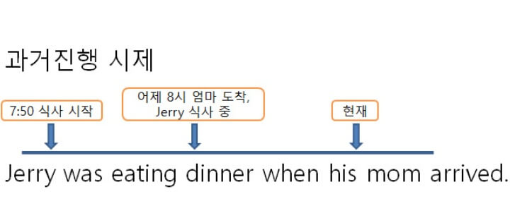 과거진행의 형태는 was, were ~ing입니다. 과거진행은 시작부터 과거 시제와 연결되는 문장으로 보시면 이해가 더 빠르실 것 같아 연결 문장을 보겠습니다. 아직 하지는 않았지만 was eating동사와 arrived동사 두 개를 쓰려고 할 때 필요한 친구가 접속사"when"입니다. 미리 하나 챙겨가세요. 계속 이어 보겠습니다. 엄마가 도착한 시점이 8시입니다. Jerry가 밥을 먹기 시작한 시점은 7:50이고요. 엄마가 도착한 시점에도 밥을 먹고 있었네요. 이럴 때 우리는 과거진행시제를 사용하면 되는데요. 그냥 과거보다 좀 더 긴 행위를 했었다의 느낌을 주기 위해 사용합니다.