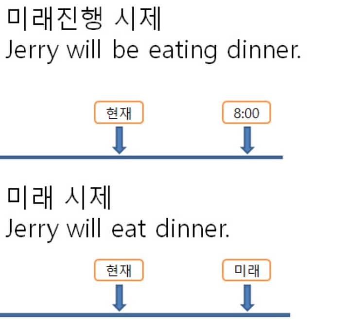 먼저 현재진행 시제입니다. 형태는 am, are is, ~ing의 형태를 가집니다. 이때 ~ing는 현재분사라고 말씀드렸고 동명사가 아닙니다. 이런 형태를 가지며 ~하고 있다 정도의 해석을 하는데요. 이 해석만을 가지고는 그리 쉽게 설명이 되지 않아 위의 그림을 통해 설명을 해봅니다. Jerry is eating dinner. Jerry가 지금 밥을 먹고 있는데요. 시각화를 좀 시켜봅니다. 지금 시간은 저녁 7시입니다. 저녁을 먹기 시작한 시간은 6시 50입니다. 그리고 아마 7시 조금 지나서도 먹을 거 같아요. 이때, 우리는 현재진행 시제를 사용합니다. 저번에 현재시제가 늘 그러한 거라고 말씀드렸는데요, 그러면 Jerry eats dinner.이라고 하면 Jerry는 저녁을 거르지 않고 매번 챙겨 먹는다 정도의 의미가 됩니다. 기본이긴 하지만 두시제의 차이점 한 번 보고 가시고요.
